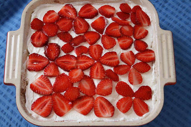 Una volta terminato, mettete il composto in frigorifero e occupatevi delle fragole. Ora, esse devono essere fragole fresche, non congelate! Lavatele e tagliatele a fette o a cubetti, se le preferite.